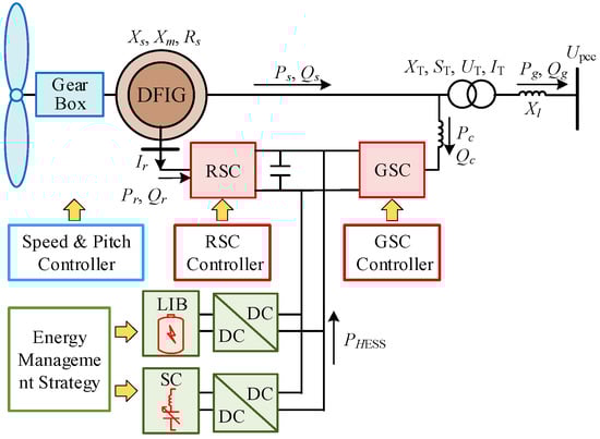 The application of energy storage provides a new method for optimizing the output power of the wind farm. In [26], an optimal operation strategy for active–reactive optimal power flow with embedded wind generation and battery storage was proposed, which was further improved in [27,28] and was applied to the electricity market in [29]. In [30], a distributed consensus control method for output power of DFIG and energy storage was proposed, which could realize energy management under different wind speeds. A system consisting of wind turbines, supercapacitors, and power converters was built in [31,32], and the supercapacitors can be used to reduce wind turbine output fluctuations. A hybrid energy storage system (HESS) is considered a new power supply technology. The application of HESS in DFIG can ensure the rational utilization of wind energy and maintain the active power of the wind farm. Generally, HESS includes lithium-ion batteries (LIBs), supercapacitors (SCs), etc. DFIG with HESS could satisfy a wide range of compensation requirements of PCC, that is, it can deal with the adverse effects of wind speed variation and load impact. Different from the wind farm level HESS, integrating the HESS technology into the wind turbine generator level could avoid high computational workload and centralized processing of a large amount of data. The structure of the HESS connected to the DC link in the DFIG could realize the timely dispatch and regulation of the output power in the wind turbine generator level. The structure of DFIG with HESS could optimize the operation characteristics of the DFIG, which is conducive to ensuring the stability of power in the wind farm and make the coordinated control of multiple units facilitate [33,34].