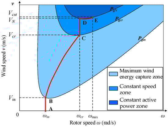 The stator windings adopt the generator convention and the rotor windings adopt the motor convention. The direction shown in Figure 1 indicates the positive direction of the power flow, and the actual direction of the active and reactive power shall be determined according to the operation mode of DFIG. The wind turbine is used to capture the kinetic energy carried by the flowing air and convert it into mechanical energy. In the actual control system, there is a correlation between wind speed v, rotor speed ω, and the output active power Pg of a DFIG. The operation state and the control strategy of DFIG are different under wind speed variations. Because it is difficult to accurately detect the wind speed in operation, the corresponding optimal rotor speed command cannot be given directly. Therefore, the rotor speed closed-loop control is not used, and the output mechanical power of the wind turbine Pm is controlled to achieve indirect control of ω generally. Due to the neglect of DFIG system losses, the active power output from the wind turbine is equal to that from DFIG to the power grid, that is, Pm = Pg. The relationship among Pg, v, and ω of the DFIG is shown in Figure 2. The red curve indicates the power characteristics of the DFIG, which could be divided into four zones: the start-up zone (AB), maximum wind energy capture zone (BC), constant speed zone (CD), and constant active power zone (DE).