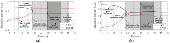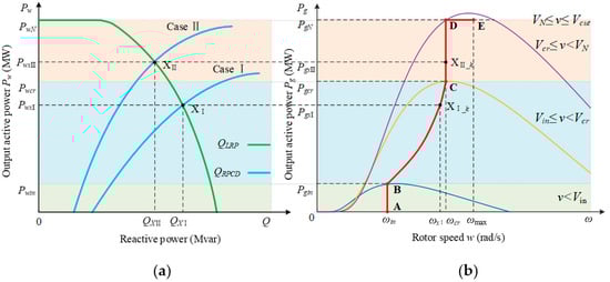 Based on the dynamic reactive power balance model, the LRP–RPCD operation curve could be acquired. The interaction between LPR and RPCD is revealed in Figure 3a, and the wind farm could compensate the reactive power required by the grid when QLRP ≥ QRPCD. The intersection X indicates that QLRP = QRPCD, which means that the reactive power output capacity of the wind farm can precisely satisfy the grid requirements for voltage control. If the RPCD changes beyond the feasible range, that is, QLRP ≤ QRPCD, the LRP of the wind farm has difficulty satisfying the demand of voltage control and the voltage instability may be induced by the insufficient reactive power of the grid. Under this circumstance, the operating state of the wind farm is required to be adjusted positively. From the trend of the RPCD curve and LRP curve, the active power reduction in the wind farm could improve the LRP of the wind farm, and the reactive power potential of the wind farm can be further explored, so as to maintain the voltage stability of PCC.