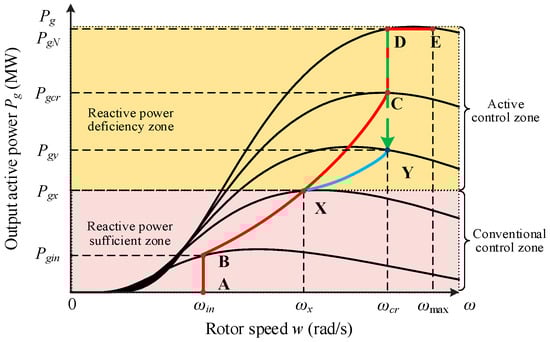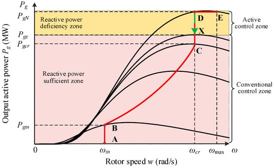 When ωx = ωcr, the critical operating point X is located in CD zone of the DFIG. When ω is less than ωx, the voltage control can be realized by adjusting the reactive power output of the DFIG owing to the sufficient reactive power margin. When ω rises to ωcr, the pitch angle control is used to further reduce the active power of DFIG and the active β control strategy is proposed. The power variation characteristics of a DFIG under this circumstance are shown in Figure 7.