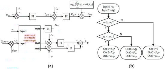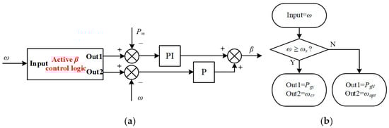 However, with the further increase in the wind speed, it is difficult to reduce the output active power only under the additional control. The pitch angle control is adopted in this stage. Pgy is the reference value of pitch compensation. The pitch angle control in the active ω-β coordinate control strategy is expressed in Figure 6a, and the control logic is shown in Figure 6b. Because of the pitch angle intervention, the operation points will converge to point Y, as shown in the green dashed line in Figure 5.
