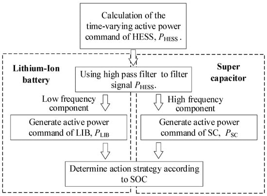 The HESS-based auxiliary control strategy takes the state of charge (SOC) as the judgment basis to assist in the realization of the active voltage coordinate control. In order to protect the energy storage equipment, the SOC limitation of the LIB and the SC should be considered by the HESS-based auxiliary control strategy, that is, the components will not be charged or discharged when the power limit is reached. By real-time monitoring the SOC of the LIB and the SC, the energy management strategy could ensure that components can respond to the power demand at any time, and avoid overcharge and over-discharge. The proposed HESS-based auxiliary control strategy could be represented in Table 1.