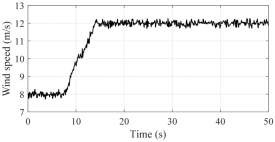 This case considers the point X located in the BC zone satisfies ωin ≤ ωx < ωcr. The load in case I is 10 MW + j9Mvar. The impact load is 1 MW, which is connected at 30 s and cut off at 40 s. The wind speed increases from 8 m/s to 12 m/s within 6 s. The wind speed model is shown in Figure 11.