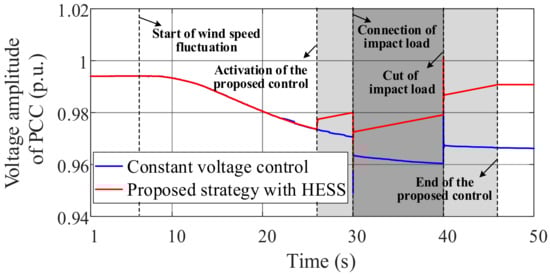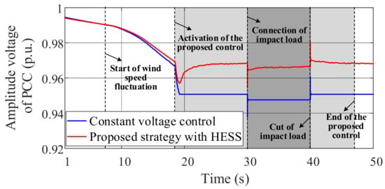 The increase in the wind speed leads to the decrease in the PCC voltage amplitude from 0.995 p.u. to 0.966 p.u. when the constant voltage control is only adopted by the DFIG. The impact load caused the voltage of PCC to drop further to 0.96 p.u. The voltage amplitude of PCC is shown in Figure 12.