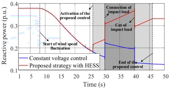 The output active power of the wind farm is shown in Figure 26. When the constant voltage control is adopted only, the Pw of the wind farm increases from 0.196 p.u. to 0.878 p.u. under the wind speed variations, shown via the blue line in Figure 26. While the active power output by the wind farm is reduced when the active voltage coordinate control without HESS is used by the DFIG, shown by the black line in Figure 26.