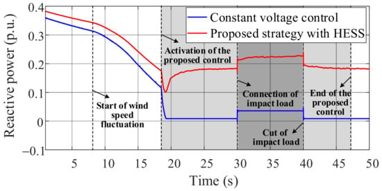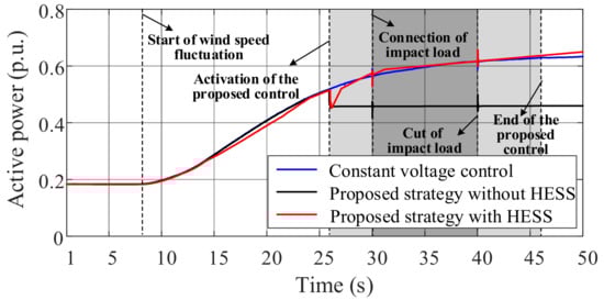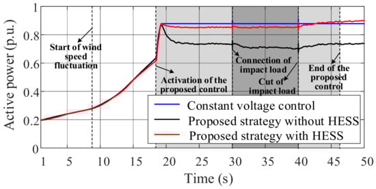 The output active power of the wind farm is shown in Figure 17, which is used to verify the system response of HESS. When the constant voltage control is adopted only, the output active power of the wind farm increases from 0.184 p.u. to 0.634 p.u. under the wind speed variation condition, as shown via the blue line in Figure 17. While the output active power of the wind farm is reduced to 0.459 p.u., when the active voltage coordinate control without HESS is used by the DFIG, shown by the black line in Figure 17. The output active power reduction in the wind farm caused by the active voltage coordinate control leads to the waste of primary energy.