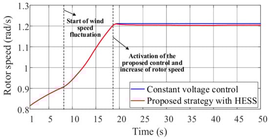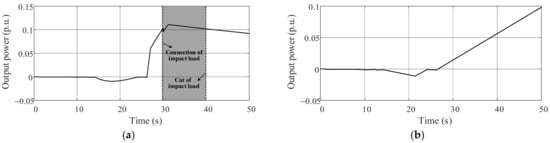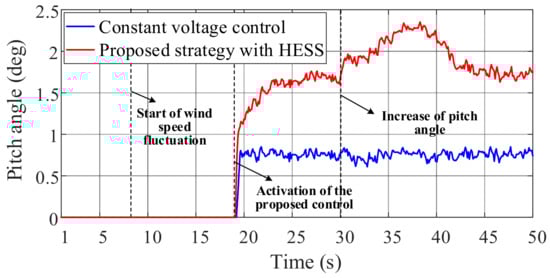 In the scene of wind speed change, the reactive power decreased from 0.378 p.u. to 0.125 p.u., when the constant voltage control is only adopted by the DFIG, as shown via the blue line in Figure 13. Although more reactive power is output by DFIG after the impact load is connected, this cannot stabilize the voltage fluctuation of PCC. In the actual system, the rotor speed which is proportional to the wind speed changes slowly. At around 50 s, the rotor speed of the wind turbine increases to the critical speed under the variation of the wind speed shown via the blue line in Figure 14. The pitch angle remains at 0°, emerged via the blue line in Figure 15.