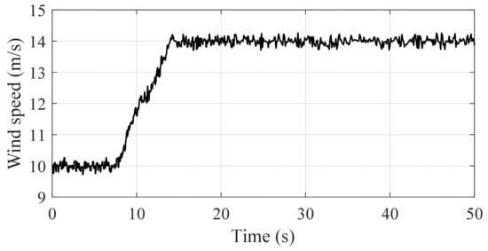 The load in case II absorbs 11.25 Mvar reactive power. The impact load is 1 MW, which is connected at 30 s and cut off at 40 s. The wind speed increases from 10 m/s to 14 m/s within 6 s. The wind speed curve is shown in Figure 20.