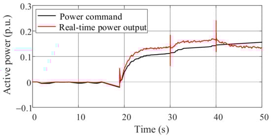To improve the utilization rate of the wind energy and ensure the power flow stability of the grid, HESS is used to maintain the output active power of the wind farm constant. Because of the HESS, the wind energy could be fully utilized, that is, the output active power of the DFIG with active voltage coordinate control is basically consistent as that with constant voltage control, shown by the red line in Figure 17. The output power of the LIB and the SC is shown in Figure 18, and the power command curve and the real-time power output curve are shown in Figure 19. The HESS-based auxiliary control strategy is applied in order to ensure a sharing of the energy flow between different elements, and the high pass filter is used to form the power demand of the LIB and the SC, respectively. It can be seen that the application of HESS effectively improves the utilization rate of primary energy, and the fast response characteristics of HESS can effectively suppress the harmful effects caused by the impact load.