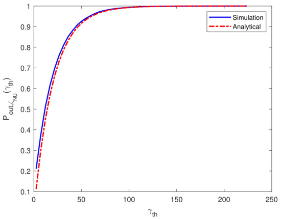 First of all, we validate the derived analytical expression of outage probability for in Figure 2 by comparing the Monte Carlo simulation results with the one obtained via the analytical expression in Equation (14) with eigenvalues calculated from the matrix and setting . It can be depicted from Figure 2 that there is a good match between the simulation and the derived analytical expression.