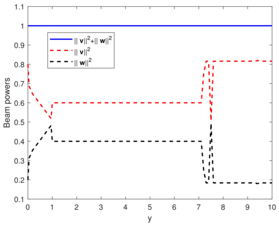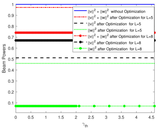 Next, we demonstrate the performance of the beamforming optimization via Equation (17). In Figure 6, the total outage probability is plotted before and after optimization by minimizing the objective function in (17) via the AS method. It can be observed that the proposed method can achieve a remarkable reduction in the total outage probability. On the other hand, the result in Figure 7 shows that the constraints on the beam power employed in (17) are satisfied for the whole range of . Thus, the beam vectors obtained via (17) maintain the total beam power to unity (i.e., ) while the beam power of the far user is greater than the that of the near user (i.e., ).