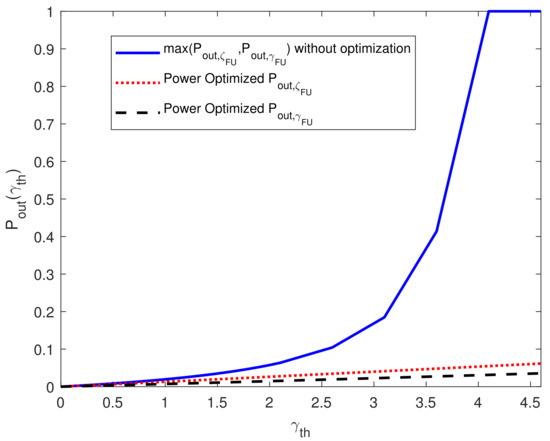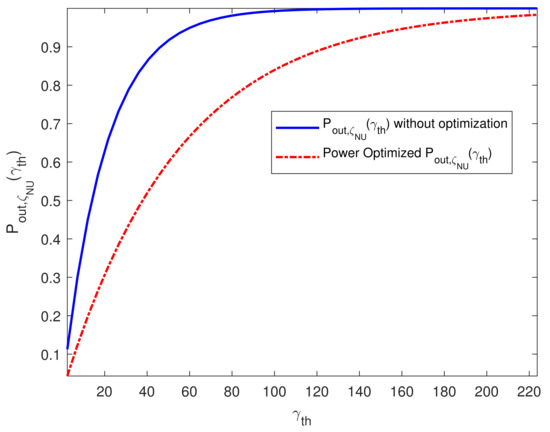 In this part, we investigate the performance of the beamforming optimization via Equation (15). The results in Figure 3 illustrate the optimization performance for beam powers , , and for two different lengths of antenna array, that is, and . It can be seen that the total beam power is minimized in both scenarios while the constraint on individual powers, that is, is also satisfied. Moreover, it can be observed that the power minimization is more for in contrast to , showing the benefit of using a larger antenna array. Next, in Figure 4, the performance of the outage probability constraint for is investigated for , which clearly exhibits a reduction in outage probability, thereby satisfying the constraint successfully.