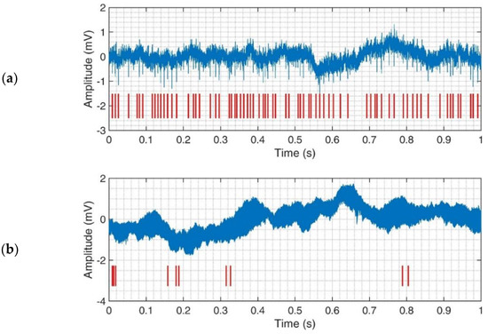 Real data (with an annotated ground truth) are, instead, collected by Mizuseki et al. [25] and made public through Collaborative Research in Computational Neuroscience (CRCNS) data sharing platform. The dataset contains multichannel simultaneous recordings made from layer CA1 (hippocampus region) of three subjects during open filed tasks. The experiment duration ranged from about 17 s to more than 1 h. The wideband (raw) data was recorded at 20 kHz, simultaneously from 31 to 64 channels (4 or 8 shanks). The data are then post-processed to extract the time stamp and clusters of the putative spikes by using a “gold standard” spike sorter tool Klusters [26]. For the sake of simplicity, we extracted a frame of 10 min from an 8-shanks record (64 channels) and we estimated the SNR by subtracting the waveforms of the sorted spikes from the raw frame. According to our analysis the mean value of SNR across all the recording matrix (8 × 8) is about 10 dB. Figure 1a,b show a 1 s frame of both synthetic and real recording from 1 channel.