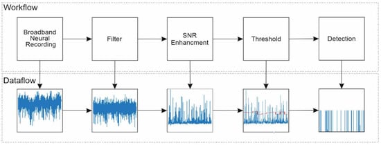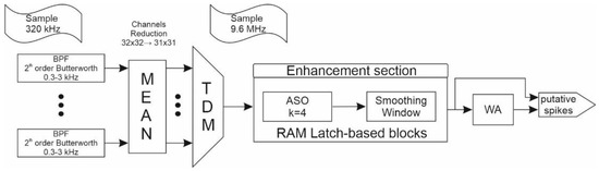 Brain-machine interfaces (BMIs) or Brain Silicon Interfaces (BSIs) enable the communication between the brain and the outside environment by conveying signals acquired from the brain to control actuators such as computers or robotic arms, with potential to restore motor function in individuals with disabilities [1,2]. Advances in microelectronics made it possible to use high-density microelectrode arrays (MEAs) which provide measurements of high accuracy and, consequently, the possibility to simultaneously record large neuronal populations at high spatiotemporal resolution with a good signal-to-noise ratio (SNR) [3]. The newer implantable neural interfaces can record up to 1000 s channels, however such a large number of channels poses major challenges for the communication link, for both wired and wireless systems [4,5]. Limited communication bandwidth and power limitations require data reduction to be performed on-chip before transmission, and spike detection is one way of accomplishing this. It is also essential that any spike detector must be low-power to prevent heat-related tissue damage and low-area to be implantable. On the other hand, requirements on the algorithms implemented in hardware are that they must be accurate, automatic, real-time, and computationally simple so as to stay within the power limitations [6].