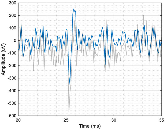 A 15 ms frame of synthetic extracellular signal. In grey the input signal, while the filtered signal is highlighted in blue. One can notice the decrease of noise contribution as well as a light but negligible shift on the right because of non-linear phase of the IIR.