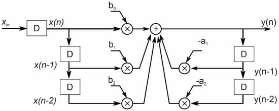 The 2nd order Butterworth filter with a bandwidth of 0.3–3 kHz is implemented by using the direct form I depicted in Figure 6. The coefficients are first properly scaled to ensure an overflow-free condition and expressed in integer domain with 10 bits. The filtered signal is represented with the same bit width of the input (10 bits) by scaling the filter denominator coefficients. In this way we act on the magnitude response of the filter, working with zeros, leaving unaltered the phase response. The scaled coefficients with their respective rounding errors are listed in Table 1.