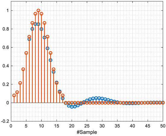 The second filter included in this implementation is a finite impulse response (FIR) filter known as smoothing, in our analysis we considered a hamming window. As described previously, the optimum length of the window is about 4 times the tuning parameter, that in our case is 4, hence the hamming window length is 17. This means that for a channel with 961 pixels in series the number of registers is 16,337 × W, where W refers to the depth of memory (i.e., bits width). Such a large number of registers would have a negative impact on the area and power of the system. A solution we investigated is the design of an equivalent IIR filter, as IIR filters require less registers than their FIR counterparts. The analysis focused on finding an equivalent IIR providing the best mean-square approximation to the impulse response of the hamming window. The analysis was carried out by using the MATLAB function prony which follows Prony’s method [34]. We varied the order of the equivalent filter and finally choose a 4th order IIR with a root-mean-square error (RMSE) of 3.7%. This has enabled Hamming FIR filter resources and latency to be reduced by half. Both the impulse response of the analyzed filter and the scaled coefficients with their respective rounding error are shown in Figure 7 and Table 2.