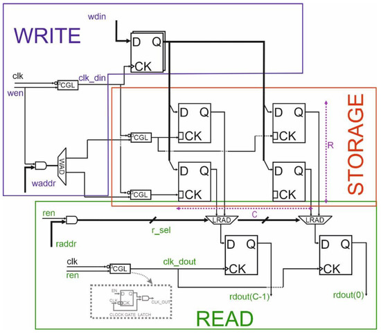 The embedded memory array is composed of RxC latches (R = C = 2 in this figure). The data (wdin) stored in the FFs register is written to the respective row by asserting its write enable (wen) coming from the Write Address Decoder (WAD). The read process involves Local Read Address Decoder (LRAD) to select the C latches composing the word. The grey box shows the implementation of the clock gate cell which let the clock signal pass if the enable is asserted.