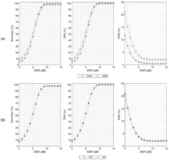 From the detection metrics shown in Section 3, it is visible that the ASO method performs better than NEO in detecting the spikes at lower SNR. This trend also highlights in Figure 11a where the ratio between the energy operators’ detection metrics is plotted under the same conditions. With SNR levels lower than 5 dB, the ASO outperforms its counterpart with a factor of almost 2× while at higher SNR values there is no visible difference between them. On average, the ASO shows an increase of 10% in accuracy and TPR whereas a worse behavior in detecting noise as spikes (FPR) is observed. However, an average increase of 30% of FPR can be considered acceptable as the main goal of the spike detector is to rightly detect as many true spikes as possible, accepting a light deterioration of the false positive. This is true since an off-chip spike sorter algorithm will be applied on the putative spikes which will be discarded the useless information. In addition, by considering the reduction offered by ASO in terms of arithmetic operations and memory registers, it can be considered a good alternative of the well-known NEO. The further analysis carried out by replacing the Hamming FIR with an equivalent 4th IIR shows a light improvement on Accuracy and TPR while providing a small average increase of about 10% (see Figure 11b) which is mainly caused by the distortion provided.