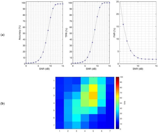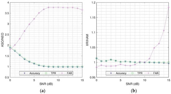 (a) Accuracy, TPR and FAR of ASO algorithm with WA and IIR as threshold and smoothing filter over different SNR levels. (b) the sensitivity matrix of the detector on real dataset.