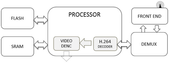 Figure 3 shows the necessary components present in receiver architectures. The air interface (e.g., frontend, also called a network interface module) device is responsible for demodulating any available DTV signal. It recovers the TS stream flows output by multiplexers, which were sent by DTV transmitters. The DEMUX component uses the frontend’s (air interface) output (transport streamflow), filters packets related to a given PID identifier (see Section 3), and outputs them in separate continuous flows. Later, those flows are forwarded to their respective decoders (e.g., H.264 video decoder), which in turn decode the content (e.g., audio or video packets) in a continuous process. Finally, the information delivered by the video decoder is passed to its respective digital video encoder (DENC) module. The next step converts digital baseband video data into analog signals (e.g., Y/C and composite video broadcast signals) to provide a video interface with other equipment (e.g., TV sets and personal video recorders). The other flows present in transport streams are also filtered by DEMUX, according to DTV tables or a given PID provided by resident applications (e.g., filter software parser) for control.