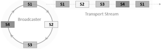 Carousels are techniques used to deliver data in a continuous cycle [49,50], as defined by the digital storage media command and control (DSM-CC) standard [51,52], which is adopted by both the Digital Audio Video Council (DAVIC) and DVB repeatedly. DSM-CC specifies two types of carousels: data and object carousels. The latter extends the data carousel by setting a file system directory structure (e.g., media files, applications, image files, and directories).