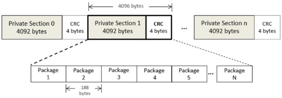 Thus, according to data streaming’s rules, a hardware bitstream must be divided into private chunks 4092 bytes in length (including the header), as illustrated in Figure 6. In Table 2, identification of the private section content identification is given by table_id, an 8-bit field of private_section(), while section_number presents the sequential number, which is used to keep the correct order for data remounting. It is worth noticing that sections can arrive out of order. Therefore, resident receiver systems must implement a mechanism to maintain the correct section order.