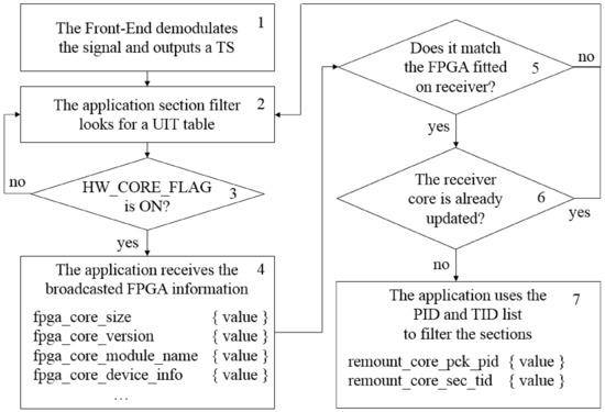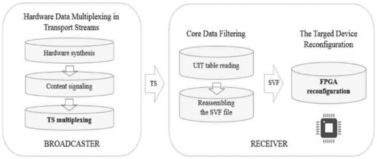 Figure 9 summarizes HARD, as explained in Section 5.1, Section 5.2, Section 5.3, and Section 5.4. As shown in Figure 9, HARD provides the transmission of pre-synthesized hardware cores through MPEG-2 TSs in such a way that the FPGA devices integrated into the commercial receivers are addressed. Aside from that, the same content transmission strategy already used for general data and SI (e.g., tables and sections) in digital television systems [56,57] is employed.