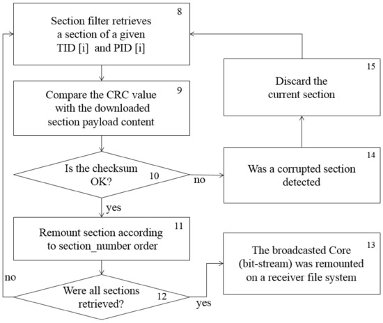 Indeed, the great concern lies in the data recovery procedure, which must be reliable and provide an error-detecting capability [48]. There is infrastructure regarding data recovery through carousels [45,46]. However, they use complex structures, which incur a significant overhead and high computational effort due to its dependence on a network protocol and data piping providing synchronization capability. Aside from that, hardware reconfiguration files are not complex, which suggests simple transport mechanisms. Therefore, a good option is data streaming through private sections, which is simple and already provides error detection tools and support to delimited and asynchronous data, with structures less complex than those used in carousels. In summary, the reconfiguration file can be partitioned into sections, enumerated according to their insertion order, and cyclically repeated as shown in Figure 5.