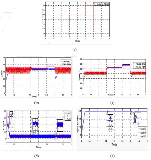 Figure 9e shows the rotor speed variation of the induction motor using the two techniques of MPPT. Good responses in starting performance and steady-state can be observed, with good dynamics and negligible overshoots and without static errors. It can also be seen that the rotor speed follows the reference values and is affected by the increase/decrease of irradiation from (500 W/m2 to 1000 W/m2)/(1000 W/m2 to 500 W/m2).