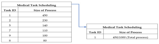 The problem initiates by letting a set of ‘m’ activities with their schedules S = {s1, s2, s3,.., sn}, and a set of infinite processing with their capability P = {p1, p2, p3, …}, whereas we examine and analyze the schedules of all ‘m’ tasks programmed to be performed, the capacity of the medical-data processing in the fog node is not exceeded and idle time is minimized. In a healthcare environment, the number of possible schedules increases rapidly; the difficulty in processing this data is due to the number of utilized services by patients and the large set of activities generated [40]. This whole scenario often causes delays during the task-scheduling process; as a result, the ease of efficient task scheduling is decreased drastically [41]. An example task is appointments for medical consultation.