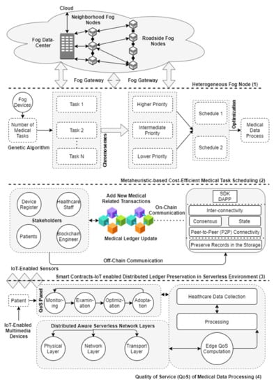 In the proposed QoS-ledger, we present a collaborative study of smart contracts and metaheuristic algorithms (genetic algorithms) for secure QoS and cost-efficient task and service scheduling, with optimization during medical-data processing in healthcare applications. This adaptive computational framework presented several key aspects, which are important for the efficient allocation of resources during medical-data processing, and to optimize the pathway of healthcare service delivery at the distinct layer. Initially, we collect data through the fog nodes, where the neighborhood fog nodes are connected directly with the edge servers. All the initial data generation is held in these nodes, and the roadside fog nodes handle various requests generated by the patients. The edge gateway manages the medical media services and access requests through the registered multimedia devices, as shown in Figure 3 (1). The elderly patients request different medical services in real-time. A number of medical task schedules and the scheduler of emergency services are engaged for an allocated time frame. As shown in Figure 3 (2), the cost of task scheduling is measured continuously while patients avail services. In the process of task optimization, the individual task gets prioritized by the medical scheduler, which is shown in Figure 3 and then executes the task separately and concurrently with effectiveness.