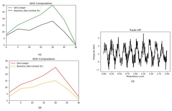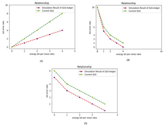 It was observed that the performance of modulations (a level of modulations) in this proposed QoS-ledger, where the binary and multi-array strategies were examined and analyzed for the fluctuation of modulation levels, to calculate these relationships through the energy bit per noise ratio and bit rate error, as depicted in Figure 4. However, we also observed that there was close coordination between the current QoS and the simulation of the proposed QoS-ledger for tuning the parameters and got results in accordance (Current: 0.075, Simulation: 0.068), shown in Figure 4.