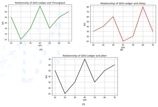 QoS-ledger’s relationship with defined QoS indicator matrices: (1) QoS and throughput; (2) QoS and delay; and (3) QoS and jitter.