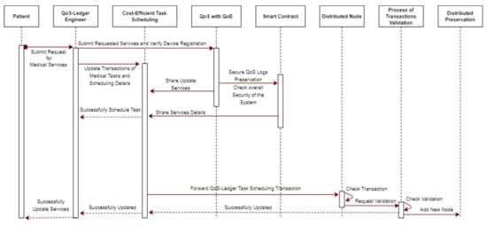 The implementation of a QoS-ledger for secure quality-of-service and cost-efficient task scheduling and services delivery executes update secureDataPreservation(), in which the QoS- and QoE-ledger directly trace and track individual service details and logs of service records that are preserved in immutable storage. It helps the QoS-ledger engineer to examine and analyze each utilized medical service by patients, and, by this act, also determines the scope of data and privacy. This engineer also maintains new registration and medical service management and produces overall statistical information related to the cost-efficient scheduler monitoring and medical-data processing with optimization. Moreover, this proposed scenario collects and analyzes each service log generated by the patient in the distributed application, cost-efficient task and services scheduling information, patients’ experience records, and ledger updates, including the meta-records, timestamp, and other affiliated medical-related information and preserves in protected storage.