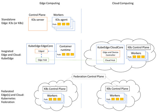 Supported by the Cloud Native Computing Foundation [29], Kubernetes is emerging as a primary choice for container orchestration for cloud-based deployments. There are lightweight and minimal versions of Kubernetes to be ideally applicable in edge domains, and different proposed Kubernetes architectures to be used in edge environments that support either all-in-one edge installation or different levels of cooperation between the edge and cloud computing domains presented in Section 2.3.3.