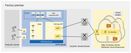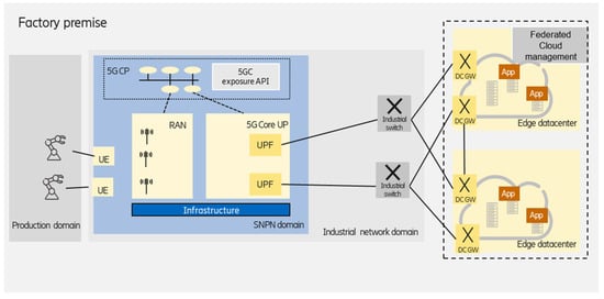 As shown in Figure 2, in this scenario, all of the user plane and control plane functions required to operate the NPN are physically located on factory premises. The edge deployment that hosts the latency-critical industry applications (e.g., cloud-based mobile robot control) is also on-premises, and dedicated infrastructure is used for the edge. Due to the totally separated infrastructure for the edge and SNPN domains, this scenario ensures the highest isolation for the industry applications running at the edge.