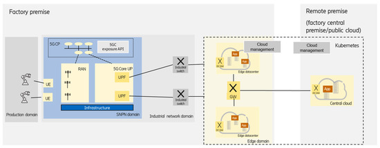 - Beside the on-premises edge data center(s), a central (public or private) cloud premises is also used for hosting industry applications/application functions with relaxed requirements (e.g., latency).
