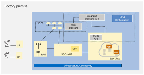Edge computing [6,7] provides an ecosystem where the execution environment (e.g., compute and storage resources) is closer to the location where it is needed in contrast with a remote cloud. The proximity of the edge premises results in reduced latency between a client and the server application, so edge computing can support use cases where ultra-low latency and high-reliability characteristics are crucial. The typical usage of edge computing in smart manufacturing could be to perform tasks on the edge infrastructure that are intensive in complexity, computation, memory, and storage. For example, various analytics and monitoring tasks can be executed in the edge domain, utilizing the cloud capabilities (e.g., resource scalability, robustness, flexible application software management) and processing huge amounts of data locally. However, edge computing with (near-) real-time cloud execution capabilities, integrated with 5G NPNs and Ethernet-based industrial networks will be able to provide ultra-low end-to-end latency to support a wide range of the time-critical Industry 4.0 use cases. Moreover, such an edge computing solution enables offloading of the time-critical industrial device (closed-loop) control functions, such as mobile robot control intelligence from the device to the edge domain.