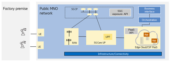 The option when the public network hosts the PNI-NPN could be suitable for such industry use cases when the service requirements are relaxed, and it is not critical if the data goes outside the factory premises. Furthermore, this scenario is suitable for such use cases where service continuity is essential, e.g., when the UE moves to a new location and a different edge server is selected, thus, the minimization of the service interruption is a crucial point for industry applications. However, if the footprint of the MNO enables the deployment of edge computing resources close enough to the factory premises, then applications with low-latency requirements can also be supported. In PNI-NPN deployment, both scalability and reliability can efficiently be ensured in the mobile network. If the related edge computing solution (deployed on a factory premises or provided by the MNO as a PaaS) can ensure these to the same extent, then the end-to-end solution can utilize these advantages. As discussed in Section 3.4, many business and technical alternatives are possible when the MNO and third-party providers could offer IaaS or PaaS for the enterprise customers. The PaaS solution enables less flexibility than an on-premises, private edge since the edge cloud infrastructure cannot be reached directly, which causes difficulties, e.g., configuring a seamless TSN FRER–edge reliability integration. On the other hand, this option facilitates the efficient management of such application deployment, where some application functions are deployed at the edge and others are deployed in a central cloud.