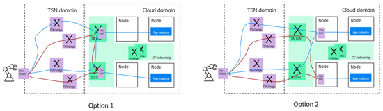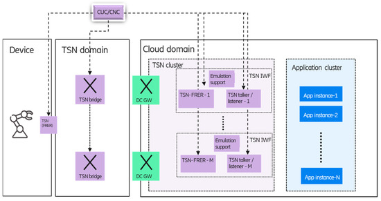 To run TSN functions on a general server, specialized NICs might be required to guarantee bounded latency and jitter for time-sensitive traffic. As shown in the integrated edge–TSN-FRER architecture in Section 4.2.1, the application and the TSN functions are split; therefore, only some nodes of the edge cloud must have these NICs. Those nodes can be labeled, and Kubernetes provides mechanisms for the placement of the application components presented in the following subsection.