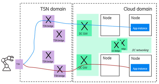 The multiple application instances handling scenario fits to greenfield deployments or for such cases when the device software is written in a way to be able to handle multiple application instances. The main drawback of this option from the viewpoint of legacy deployment is that the industrial end device software has to be adapted to the simultaneous communication towards multiple application instances. In this case, the end-to-end reliability can be provided on a per-domain basis by properly configuring the placement of the application and TSN FRER instances in the edge domain and the disjoint paths for the TSN streams in the TSN domain. It is important to mention that in this scenario, reliability can be provided even without TSN FRER; in such a case, each stream between the device and an application instance has to be configured by the CNC to use independent paths in the TSN domain.