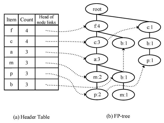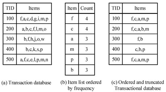 A simple example of constructing FP-Tree is shown in Figure 2. Figure 2a is an example transaction database for creating FP-Tree (the minimum support is set to three). Each row is composed of a set of items that occur simultaneously within one transaction and is classified by transaction identification (TID). To construct FP-Tree using this example transactional database, first, we need to find the frequency of the items. The database is scanned once for the first time to count the number of items represented in the database. Then, in order to make a list of frequent items, only items with a minimum support rating or higher are used to create the FP-Tree in the order of the highest frequency. Figure 2b shows items with a frequency greater than or equal to the minimum support in the order of the highest frequency.