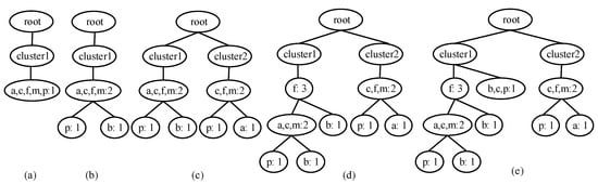 Tree representation of RFP-Tree. (a) Transaction (f,c,a,m,p) is inserted, (b) transaction (f,c,a,b,m) is inserted, (c) transactions (f,c,m,p) and (f,c,a,m) are inserted, (d) transaction (f,b) is inserted, (e) transaction (b,c,p) is inserted.