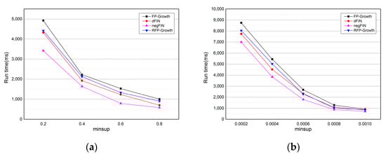 The runtime comparison of RFP-Growth against FP-Growth, dFIN, and negFIN with respect to the minsup is shown in Figure 11. In all algorithms, it appears that the runtime cost decreases as minsup increases. The best performance at runtime is negFIN, which is known as the fastest algorithm, followed by dFIN, RFP-Growth, and FP-Growth. RFP-Growth shows better performance than FP-Growth, and the runtime performance of RFP-Growth is slightly lower than dFIN and negFIN. Although RFP-Growth uses less memory, it seems that the set operation to find common items increases the time cost.