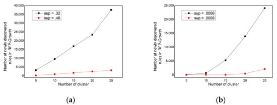 Figure 8 shows the number of newly discovered frequent rules according to the support level from the synthetic datasets. The left y-coordinate represents the number of the frequent rules found in FP-Growth. The right y-coordinate represents the number of the frequent rules that are not found in FP-Growth and are newly discovered in RFP-Growth. As minsup becomes larger, the number of the frequent rules discovered decreases. As minsup increases, the number of newly discovered rules decreases. In the section where the number of the frequent rules discovered in FP-Growth is maintained, [0.22–0.3, 0.34–0.44, 0.5–0.68], the number of newly discovered frequent rules in RFP-Growth is low. It can be seen that when the number of the frequent rules discovered in FP-Growth is reduced, the number of the frequent rules newly discovered in RFP-Growth increases. When minsup was 0.7, no rules were discovered in FP-Growth, but 20 rules were discovered in RFP-Growth.