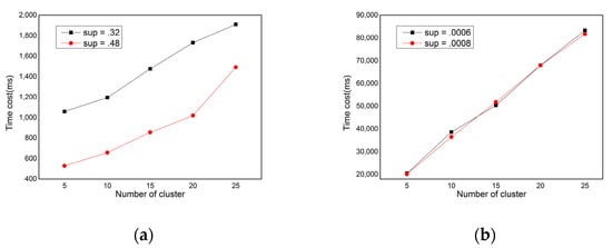 Figure 13 shows the effects of the number of clusters on the time cost in RFP-Growth. Two graphs are also shown on a linear scale. For each dataset, the time cost in RFP-Growth is approximately proportional to the number of clusters. In the synthetic datasets, the time cost is different for the two minsup (0.32 and 0.48), but in the real dataset, there is little difference in the time cost for the two minsup (0.0006 and 0.0008). This difference is caused by the difference in scale for the two datasets. What we can see from this result is that the time cost increases as the number of clusters increases.