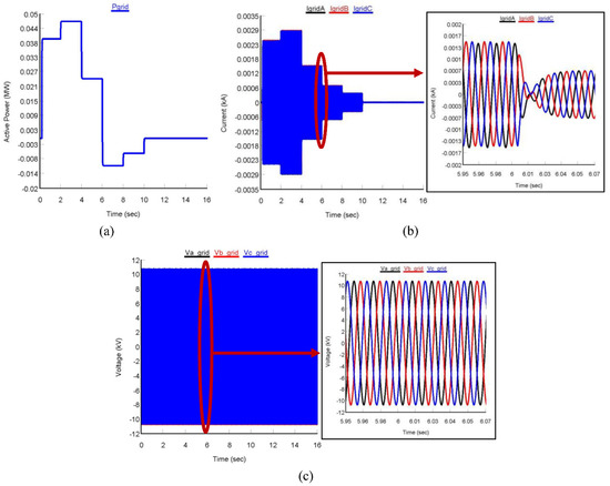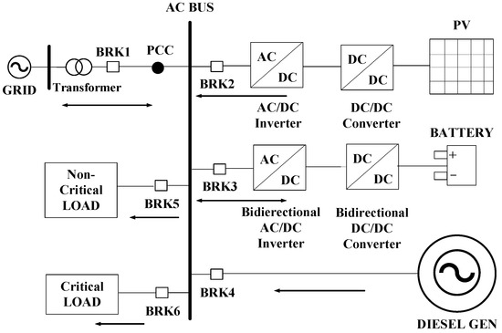 The grid-tied AC-MG testbed used in this study consisted of a PV system, a battery storage, a diesel generator and two types of load (critical and non-critical) which is represented in Figure 1. The modelling of the MG was conducted in an RSCAD platform, using modules of different components available in the RSCAD library. In Appendix A Table A1, the specifications of all the components used in the MG are depicted, which were obtained from [38]. As shown in Figure 1, two VSIs are used to connect the PV and battery storage systems with the AC bus, and the AC-MG was integrated with the grid through a 3-ph transformer.