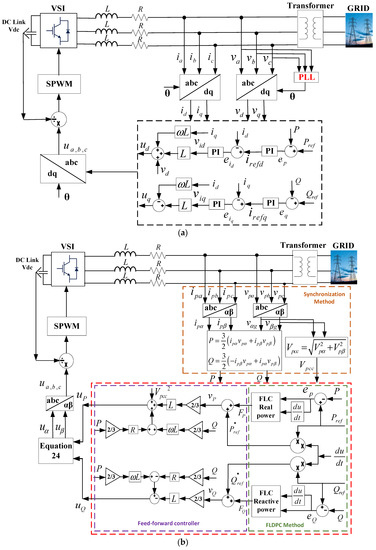 Power controllers for grid-tied AC-MG’s PV-VSI, based on (a) PLL-PI-integrated dq CCS and (b) the proposed PVMT-based FLDPC.