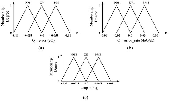 As shown in Figure 2, for obtaining zero steady state error, two error signals (eP and eQ) and their rate of change (P-error_rate and Q-error_rate) are given as inputs to two FLCs. The outputs of FLCs provided the control inputs FP and FQ for the feed-forward controllers. Due to non-availability of the FLC block in the RSCAD library, FLC is built in RSCAD software by writing codes using ANSI language in C-builder. Each FLC consisted of two inputs and one output, as depicted in Figure 2. The two inputs were the error and error-rates of power for each FLC. The membership functions of inputs and outputs were named identical for both real and reactive power. The variables representing error were NM (negative medium), ZV (zero value), and PM (positive medium). Similarly, error-rate variables were NM1 (negative medium 1), ZV1 (zero value 1), and PM1 (positive medium 1). The variables of output were BNE (big negative error), NME (negative medium error), ZE (zero error) and PME (positive medium error). In Figure 3 and Figure 4, the real and reactive power FLCs’ membership functions for error, error-rate and outputs are shown. To ensure smooth control by FLC, triangular-based membership functions were considered in this study.